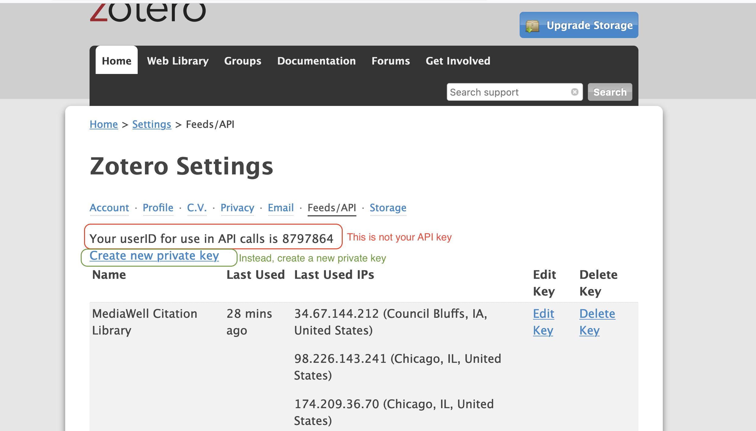 Sign in to your Zotero account on the Zotero website. Ensure that the settings on your Zotero library are correctly configured, and collect your library's ID and create an API key.&#x20;